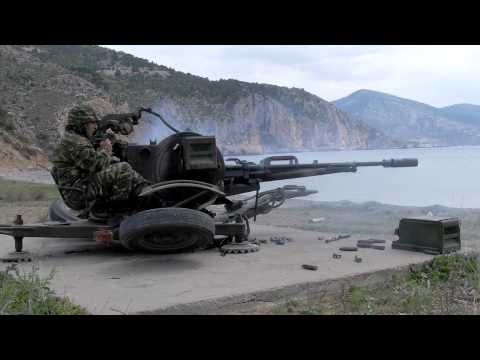 실사격 군사 훈련에서 그리스 육군 주방위군 A/A 총 ZU 23-2.