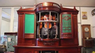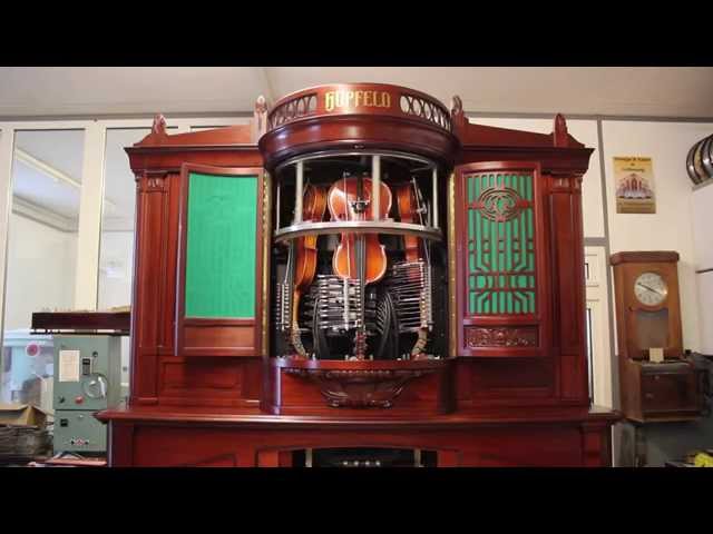 1916년경 독일제, Hupfeld Phonoliszt-Violina는 세 대의 바이올린과 함께 기계 피아노입니다. 음악은 자동으로 특별히 디자인 된 천공 용지를 사용한다.