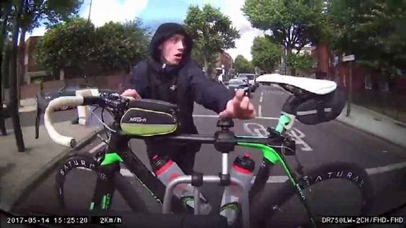 이 장면은 2017 년 5 월 14 일 일요일 런던 중심부에서 진행되었습니다.. 자전거 운전자가 교통 체증을 이용하여 3달러 가치의 Mekk Primo 경주용 자전거를 훔치려 했습니다..000 유로. 때마다 당신은 차를 정지, 자전거 타는 사람은 홀더에서 자전거를 풀어하려고했다. 그녀의 뒤에 운전자의 혼에 의해 경고되면, 드라이버는 도둑을보고 질주.