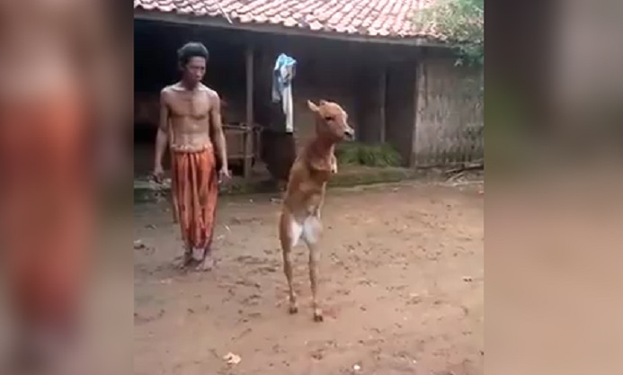 앞 다리없이 태어난 송아지, 뒷다리에 똑바로 서있는 동안 그는 사람처럼 걷고. 인도네시아에있는 마을의 작은 거리를 방황 불행한 동물.