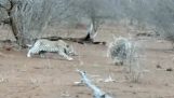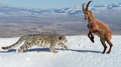 흰색 표범은 야생 염소를 사냥하고, 상황이 위험하게된다, 두 동물은 절벽에서 떨어지는 경우.
