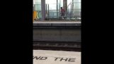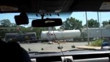 우주의 기관차 D199 '토마스와 그의 친구들'의 장난감이 나무 코스에서 표류하고 뒤집습니다..