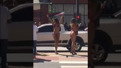 브라질 거리에서, 이 비키니 여자의 그룹의 앞에 통과 할 때 운전자는 자신의 관심을 잃게됩니다.