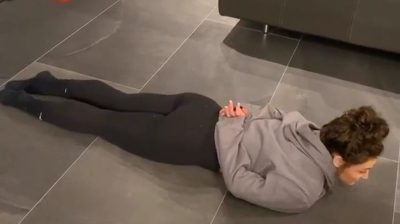 그는 그의 뒤에 자신의 손으로 바닥에 얼굴이 아래로 누워있는 동안 일어나려고. 미국 아이오와 주에서 체조 잭스 크래 니츠 도전을 성공적으로 대처.