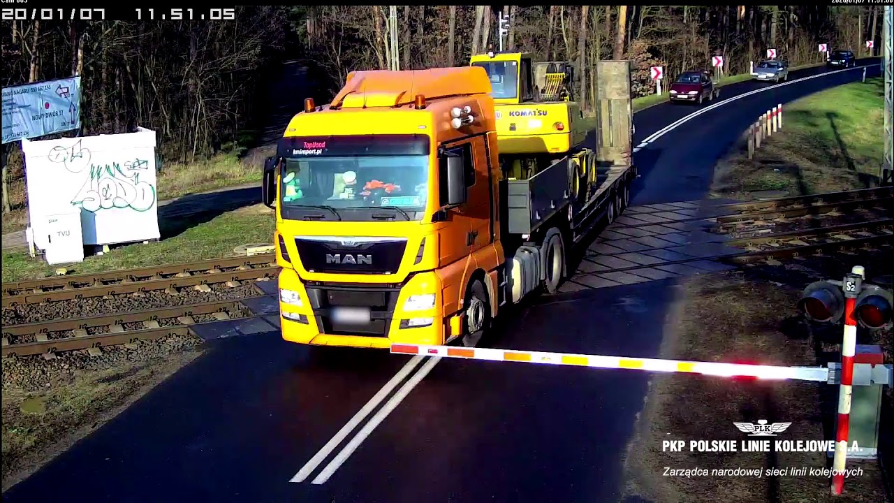 도시 Zbąszyń 폴란드, 트럭 운전사는 철도 횡단의 바 뒤에 시간에 정지에 실패. 가 중지되면 자신의 트럭 라인에 정확하게했을 것으로보고, 운전자는 가속 최악 방지하기 위해 가로 질러 통과하기로 결정.