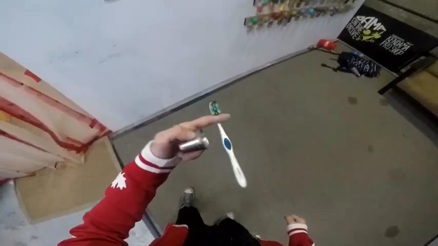 전문 저글러 Lucas Adverse는 칫솔과 작은 유리로 멋진 트릭을 만듭니다..