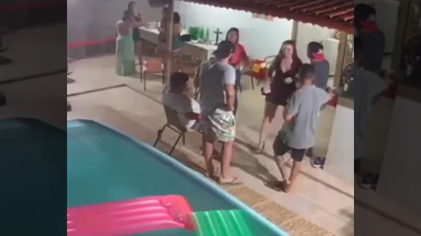 수영장 옆, 여자가 남자의 발에 걸려 넘어 질 것이다.