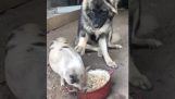 밥그릇을 놓고 탐욕스럽게 먹는 돼지를 쫓는 개.