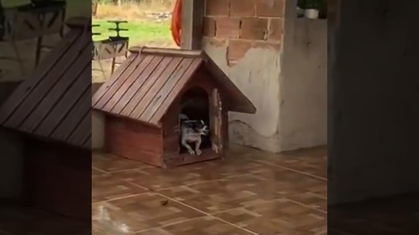개는 남자의 방해를 받으면 화가 나서 집 문을 닫습니다..