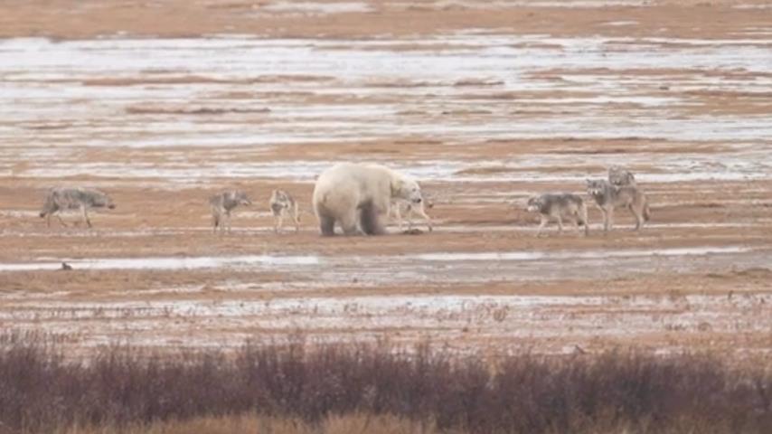 2021년 10월 28일 캐나다 매니토바의 나누크 쉼터에서 촬영된 장면. 북극곰이 허드슨 만을 따라 걸듯이, 늑대 떼를 만났다. 처음에는 몇 마리의 늑대만이 그녀를 따라 그녀의 약점을 테스트했습니다.. 점점 더 많은 늑대들이 사냥을 나감에 따라, 곰은 탈출 동작을 취하기 시작했습니다. 몇 분 후, 늑대는 곰이 너무 크고 강하다는 것을 깨닫고 후퇴했습니다.. 곰은 무사하게 남았다. 이것은 매우 드문 행동입니다, 늑대는 일반적으로 부상이나 사망의 위험이 높기 때문에 큰 북극곰을 사냥하지 않습니다..