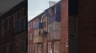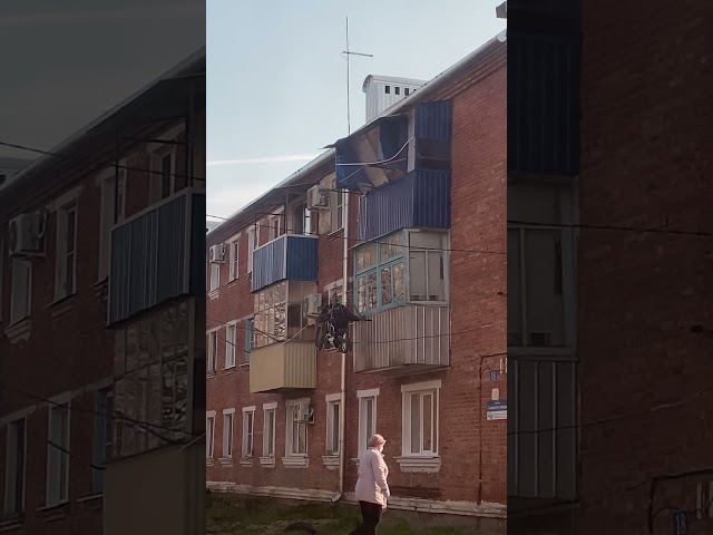 휠체어를 탄 사람이 케이블을 사용하여 2층 발코니로 올라갑니다.