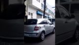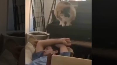 고양이가 주인을 뛰어 넘으려 한다, 하지만 정확한 계산을 하지 않는다.