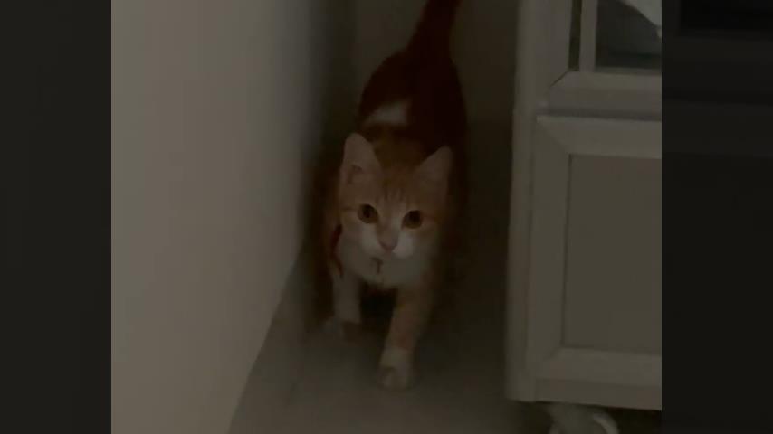 고양이는 재미있는 기술을 사용하여 옷장에서 나옵니다..