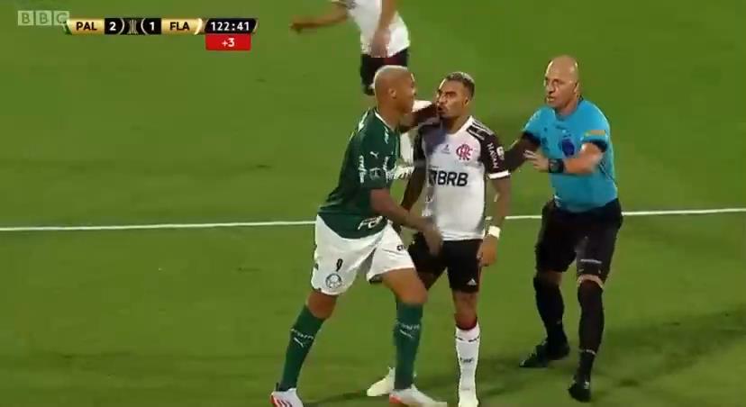 브라질 팔메이라스와 플라멩구의 축구 경기 중, 팔메이라스의 포워드, 데이버슨, 그는 경기를 지연시켰기 때문에 심판에서 제외됩니다.. 그런 다음 Deyverson은 극적인 방식으로 땅에 쓰러집니다., 상대 선수가 만졌다고 생각하는.