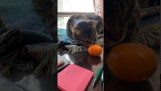 그는 개암과 패키지를 엽니 다 자신의 주인을 볼 때 다람쥐는 다시지지 않습니다. 손에 올라갑니다 ...