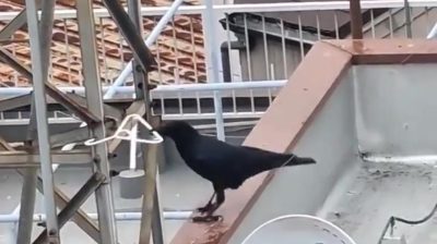 까마귀는 혁신적인 재료를 사용하여 둥지를 만듭니다, 이 플라스틱 옷걸이처럼.