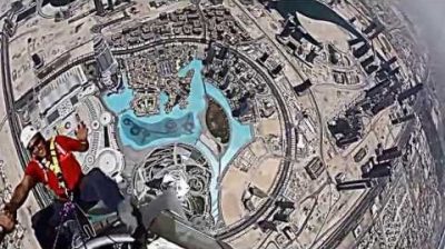 두바이에 호텔 버즈 칼리파의 꼭대기에서 그들의 경험을 기록 하는 근로자, 세계에서 가장 높은 건물.