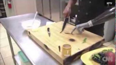 요리사 Eduardo 가르시아 후 심각한 사고는 다시 그의 부엌에서, 매우 정교한 인공 손 배치 하는 데.