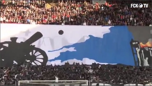 덴마크 코펜하겐 팬 Brondby 자본의 큰 상대와 싸움을 하기 전에 매우 창조 되었다. 정교한 배너를 사용 하 여, 음향 효과 및 연기, 상대팀 경기장의 '폭격'을 묘사한 것입니다.. 배너에 최근 메시지는: ' 코펜하겐은 우리 것 '.