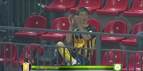 Zalgiris와 리투아니아에서 Trakai 챔피언십 게임. D. Trakai 상계 Koubas의 선수 축 하 매우 재미를 발명 하 고.