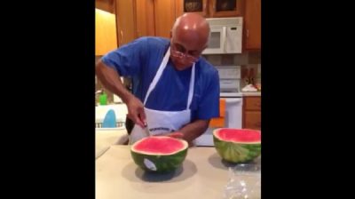 이 남자는 우리에 게 수 박을 해 부를 독특한 방식으로 보여줍니다.. 날카로운 칼과 약간의 노력, 스킨 없이 작은 달콤한 조각에 매우 신속 하 게 잘라.