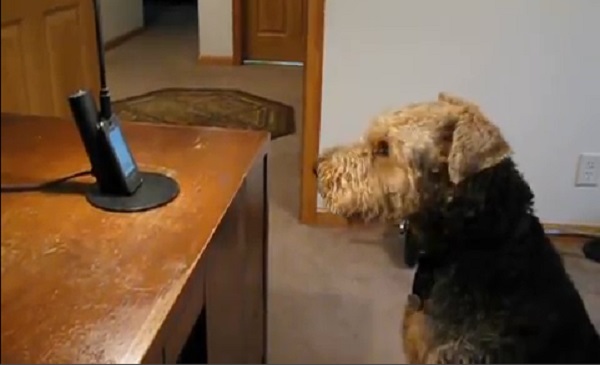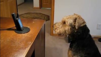 Stanlei, 개 품종 테리어 ernteϊl, 그의 idioktitria와 전화 통화를 하려고.