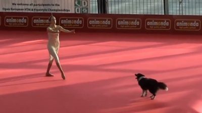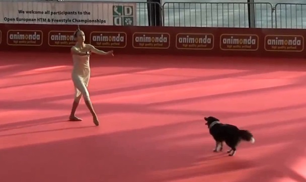 산드라 로스 훈련 된 강아지의 리 지와 함께 프리 스타일 댄스 공연과 군중 열광, 년 11 월 2014 년 유럽 댄스 대회를 엽니 다. 리 지 피트 시계로 단계 idioktitria와 동기화.