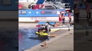제트 스키 폭발 에스토니아 누설 및 연료의 점화에 의해 야기. 라이더는 공중에 뛰어 자신의 뒤쪽에 상처와 함께 살아.