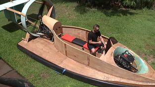 조종사 제임스 Greenberger는 어린 시절의 꿈을 성취, 온라인으로 구입할 계획을 자신의 차고에서 자신에게 호버 크래프트 만들기.