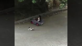 어린 소녀는 빠른 속도로 슬로프를 내려갑니다, 어린이 자동차 플라스틱. 길을 따라, 길에 있던 약간의 운이 고양이에 드래그합니다.