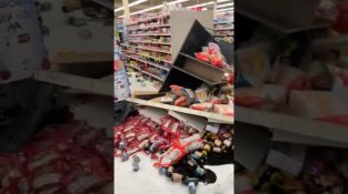자동차가 슈퍼마켓에 들어가 혼란을 일으킨다