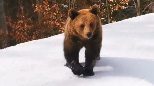 루마니아는 유럽에서 곰 개체수가 가장 많습니다.. 곰과 스키어를 만나는 것은이 남자의 평온함으로 판단 할 때 드문 일이 아닙니다, 곰이 몇 미터를 따라가는.