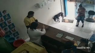 부상당한 길 잃은 개가 브라질 Juazeiro do Norte의 수의과 병원에 홀로 입원, 수의사가 그를 도울 때까지 참을성있게 기다립니다..