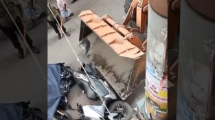 인도에서, 경찰과 동행하는시 직원, 불도저를 사용하여 불법 주차 된 스쿠터로 도로를 청소하라는 명령. 지역 주민들이 환영하지 않은 이니셔티브.