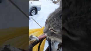 두 명의 러시아인이 쓰레기통의 금속 구조에 혀가 박힌 고양이를 발견했습니다.. 뜨거운 물 한 잔이 상황을 구했습니다.