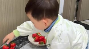 Iedere keer geeft dit jongetje aardbeien aan iemand achter een deur, hij krijgt er twee keer zoveel voor terug. Dus besluit hij ze allemaal te geven...