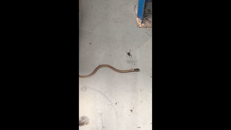 In een workshop in Cobram Australië, een jonge slang gevangen in het web van een zwarte weduwe. Toen hij probeerde zich te bevrijden, de spin langzaam naderen met een hapje werpt krachtige gif in het lichaam van de kleine reptiel, die een paar minuten later stierf.