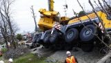 De auto rolde net voor de trailer van een kraan, bij vervoer van een workshop.