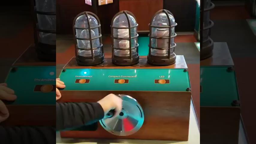 Welk type lamp geeft meer licht met dezelfde hoeveelheid stroom uit een generator; Het is iets dat kan worden gezien in de praktijk op het Franklin Institute museum in Philadelphia Pennsylvania. drie lampen, een gloeilamp, een fluorescentielamp en een LED-lamp aan dezelfde generator. Man draait de dynamo met een kruk voor elk licht afzonderlijk welke meer licht geeft. De LED-lamp wint met een verschil.