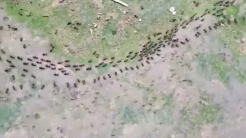 Een pad termiet (omhoog) en mieren (naar beneden), elk zijn beschermd door een factie van soldaten die tegenover elkaar staan zonder te vallen. Een voorbeeld van de verdeling van het gewas en arbeid om sociale insecten.