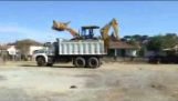 Een bouwkraan vouwt tot een zeer klein formaat achter in een vrachtwagen.