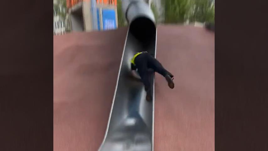 Een politieagent op City Hall Plaza in Boston, VS, probeert een kinderglijbaan uit. Maar de man overdreef het blijkbaar, terwijl hij ondersteboven belandde en van de glijbaan viel en op de grond viel.