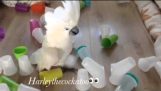 Een papegaai wordt met geweld een kat uit haar eten gedreven, Om het zelf te eten.