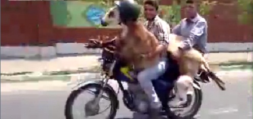 Na de geit, We zien nu en twee schapen op een motorfiets, zelfs met een helm. Twee boeren in Iran uitvoering met hem de grappige manier hun dieren.