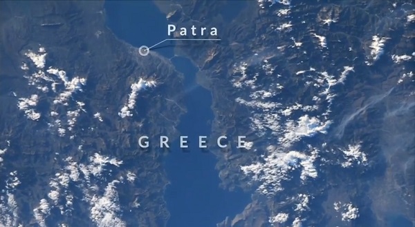 Twee leden van de bemanning naar het internationale ruimtestation (ISS) kijken vanaf rond verschillende steden wereldwijd, vanuit het perspectief van een luifel op de boot. Onder andere dingen die we zullen zien en de steden van Patras en Corinthië in Griekenland.