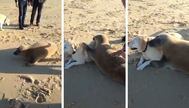 Het strand van Cap Ferret in Frankrijk, een familie naderen van een zegel dat is uit het water. Wanneer het zegel ziet de familie hond, een Labrador, de naderen en leunend aan een zeer mooie scène.