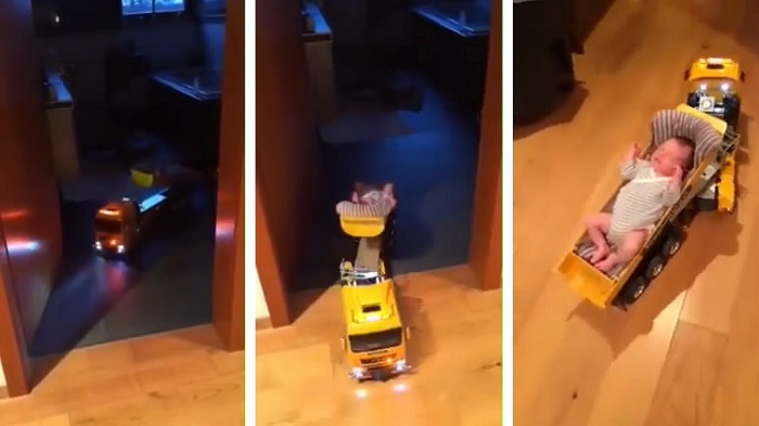 De moeder is niet thuis, en papa vond de gelegenheid om te spelen met de baby. Een externe gecontroleerde vrachtwagen rijden, zal doen een korte rit met de baby in de trailer. De kleine slapen rustig op het spel.