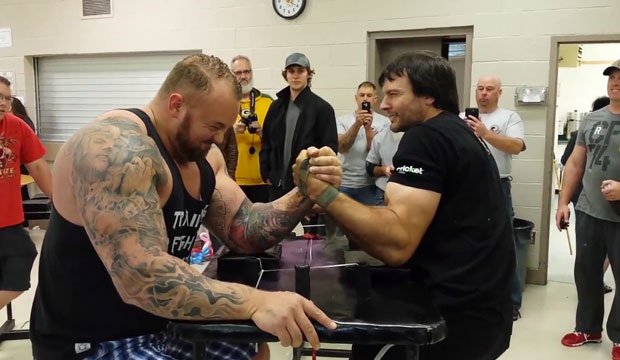 Na het winnen van het wereldrecord optillen van een gewichtslichaam 640 kg, de acteur Júlíus Hafpór Björnsson, bekend als 'The Mountain' uit de beroemde serie 'Game Of Thrones', een wedstrijd in een dubbele sparren met kampioen cheiropalis Devon Larratt.