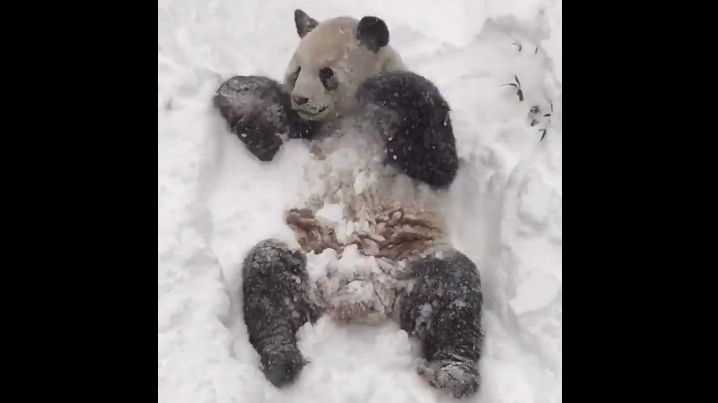 Zaterdag 23 januari 2016, de Tian Tian, een reus altijd bij de National Zoological Park, Washington, wakker met een dikke laag sneeuw op de behuizing van de, Na het verstrijken van de cycloon Jonas aan de oostkust van de Verenigde Staten. Enthousiast en gelukkig, de Tian Tian kylistike en languit op de witte laag, die betrekking hebben op zijn lichaam met sneeuw.