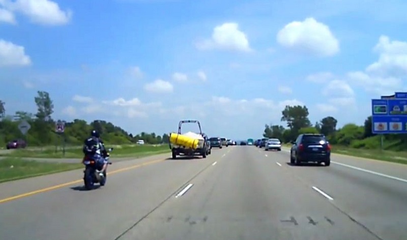 Een man rijdt met zijn motorfiets terug van een teaser trailer op een snelweg in de buurt van Woodbury, in de staat Minnesota. Plotseling, een grote laag losgekoppeld van de aanhangwagen en valt in de weg.